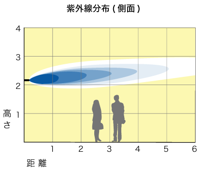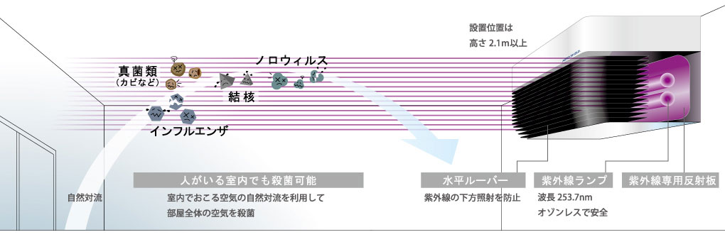 「AERO SHIELD」は高さ2.1m以上(安全基準)の天井面に紫外線の殺菌ゾーンを形成します。紫外線の中でも高い能力を持つ「UV-C」ランプを使用しており、インフルエンザ、ノロウイルスなどのウイルス、結核菌などの細菌類、黒かびなどの真菌類にいたるまて、すべての菌に対して有効です。
